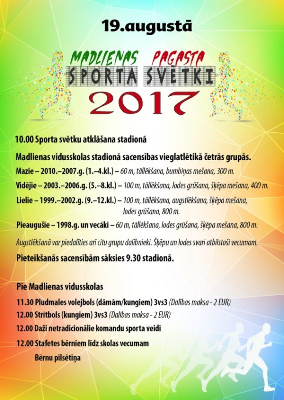 Pieteikšanās sacensībām Madlienas vidusskolas stadionā sāksies pulksten 9.30, bet pulksten 10.00 ieplānota Sporta svētku oficiālā atklāšana.