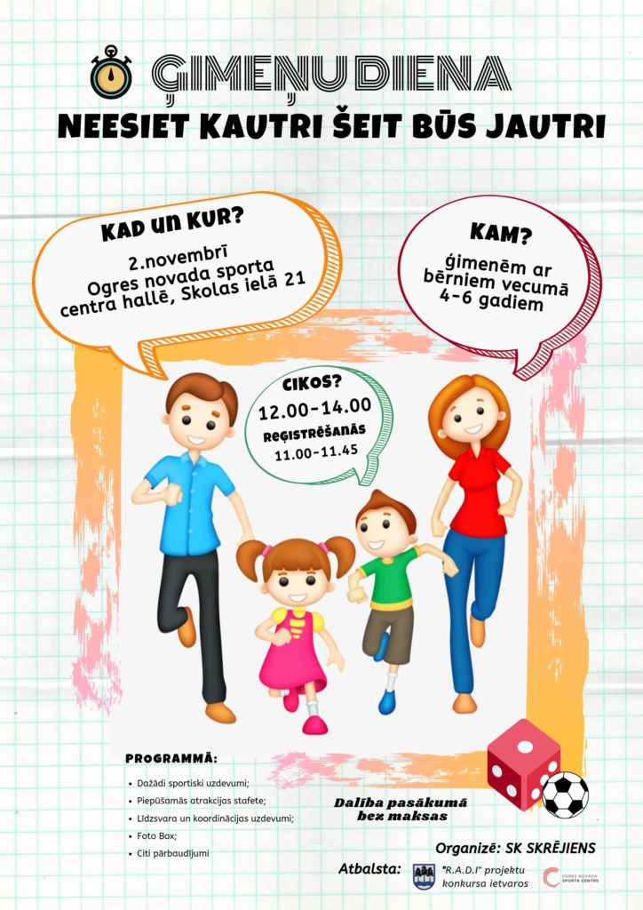 2.novembrī biedrība “SK Skrējiens” Ogres novada sporta centra hallē Skolas ielā 21, organizē ģimenes dienas pasākumu – “ Neesiet kautri, šeit būs jautri!”, kur aicināta piedalīties ikviena Ogres novada ģimene ar bērniem vecumā no 4 līdz 6 gadiem.