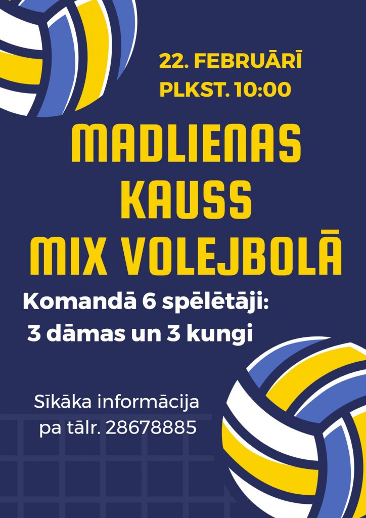 22. februārī plkst.10.00 MADLIENAS KAUSS MIX VOLEJBOLĀ. Komandā 6 spēlētāji: 3 dāmas un 3 kungi. Sīkāka informācija pa tālr. 28678885.