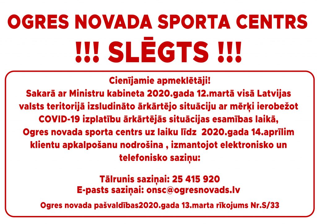 Ogres novada sporta centrs uz laiku līdz 2020.gada 14.aprīlim